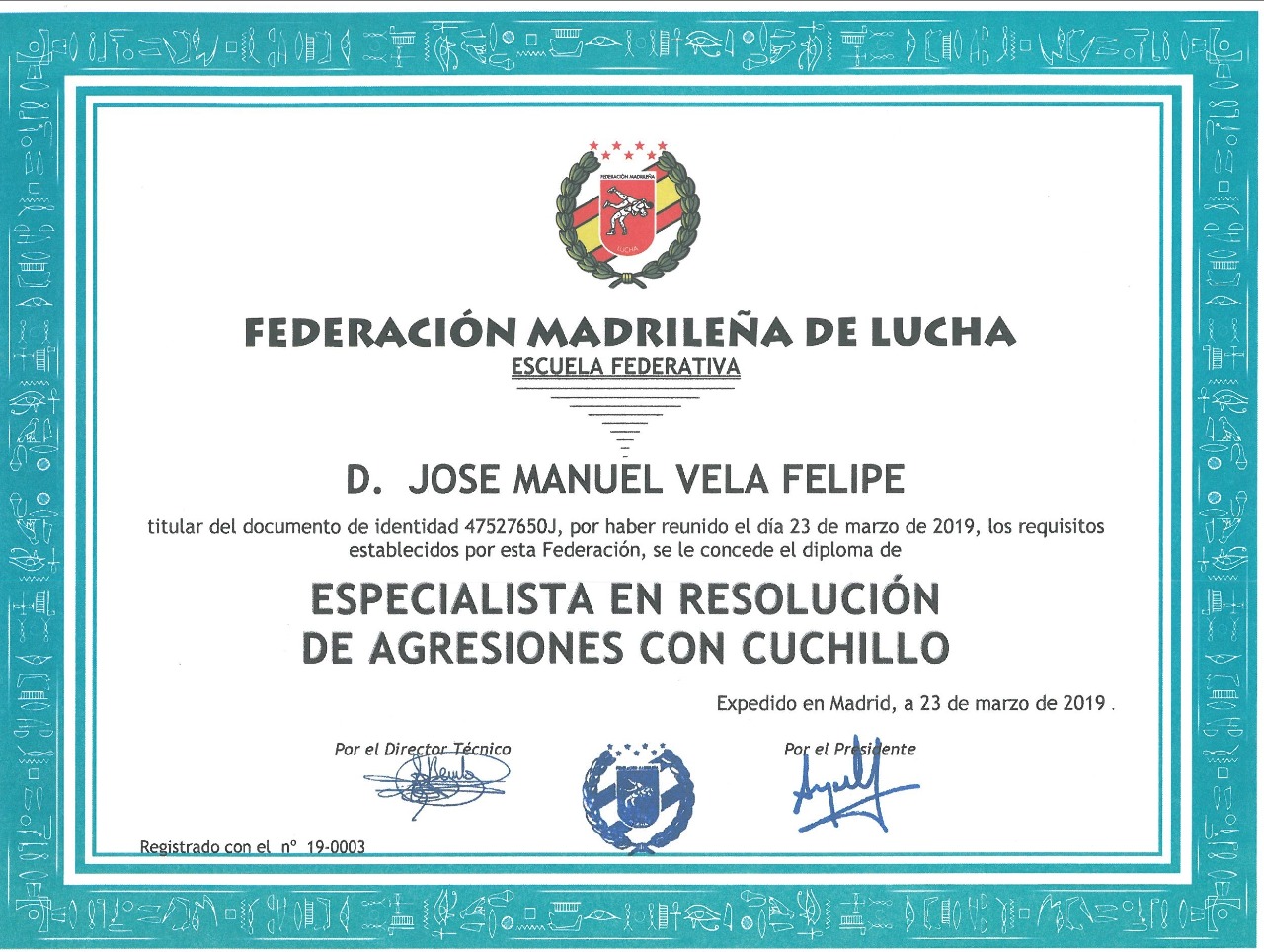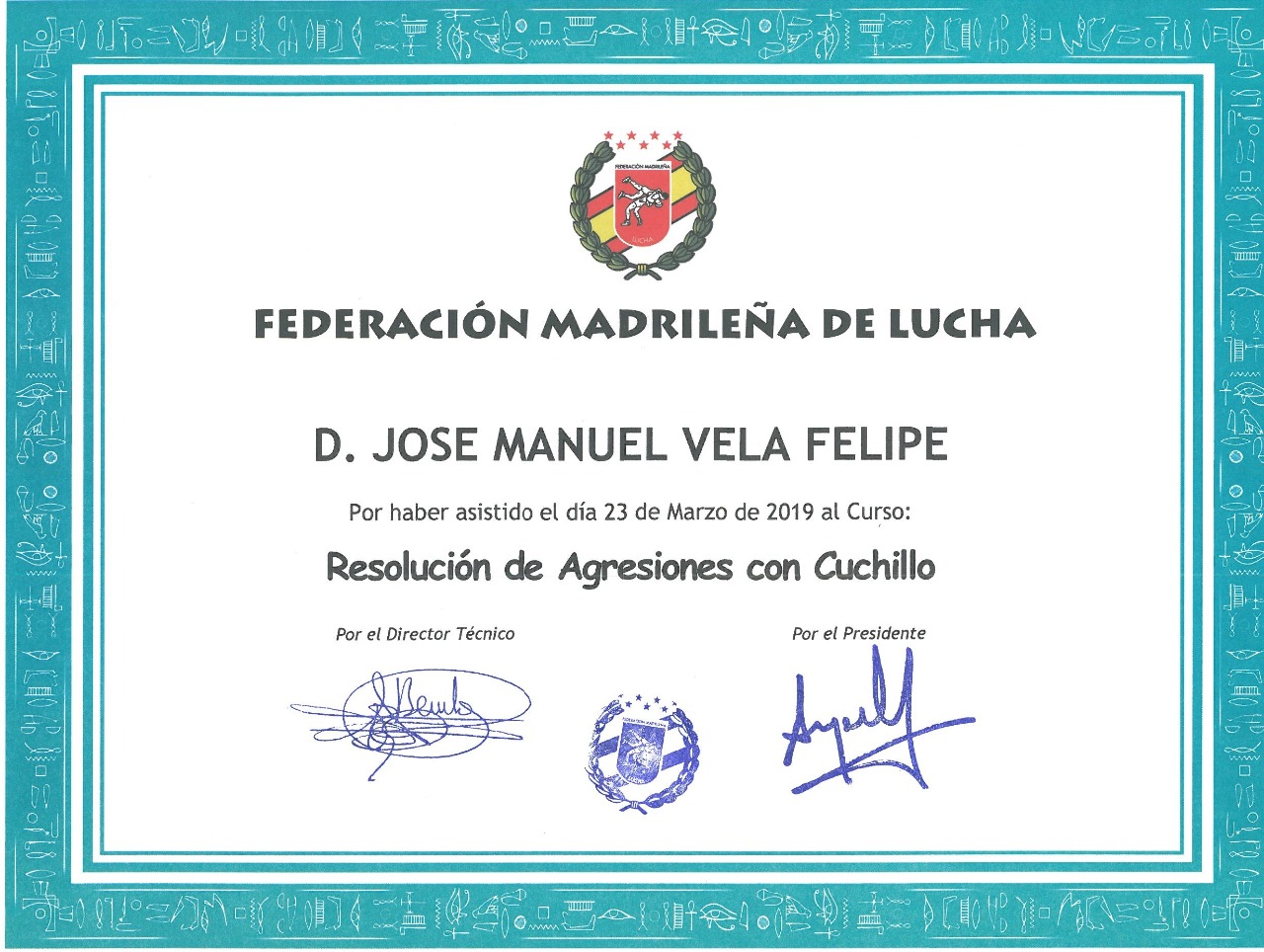 SEMINARIO EXTRAORDINARIO DE resolución ante agresiones con cuchillo , EL DIA 23 DE MARZO DE 2019 impartido por; EL MAESTRO: JOSÉ MARIA BENITO GARCIA 10º DAN DE DPP ,BP Y MAESTRO INTERNACIONAL, celebrado en el POLIDEPORTIVO CIUDAD ESCOLAR , ORGANIZADO POR LA FEDERACION MADRILEÑA DE LUCHA y DA. Turno de MAÑANA Y tarde de 10: 00 horas a 14:00 horas. Y DE 15.30 H A 19:30 H. 8 HORAS DE FORMACIÓN